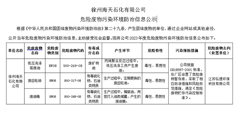 徐州德赢vwin8868官网石化有限公司 危险废物污染环境防治信息公示
