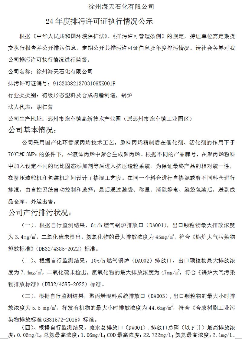 徐州德赢vwin8868官网石化有限公司 2024年度排污许可证执行情况公示